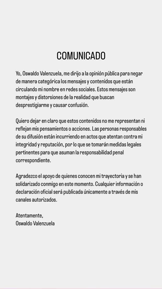 “Yo, Oswaldo Valenzuela, me dirijo a la opinión pública para negar de manera categórica los mensajes y contenidos que están circulando mi nombre en redes sociales. Estos mensajes son montajes y distorsiones de la realidad que buscan desprestigiarme y causar confusión”, publicó en su cuenta de Instagram.