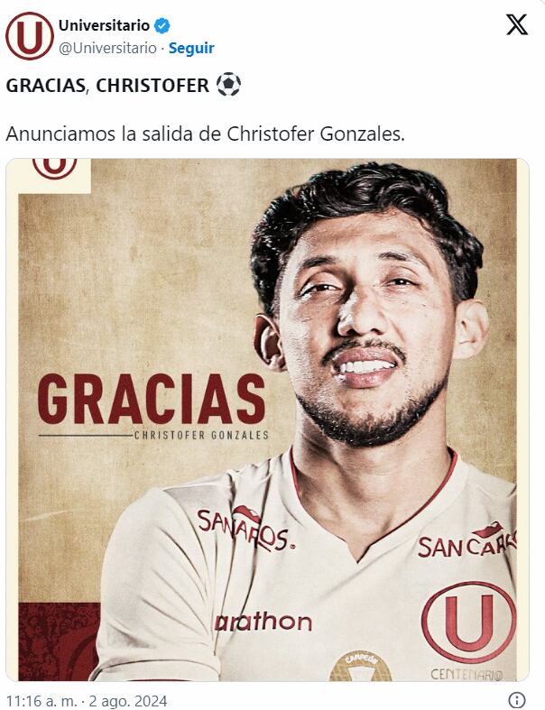 Universitario comunicó en sus redes sociales la salida del jugador, que llegó a inicios de año como uno de los flamantes fichajes para el centenario. “Gracias, Christofer”, publicó el ganador del Apertura 2024 en un movimiento que muchos veían venir.