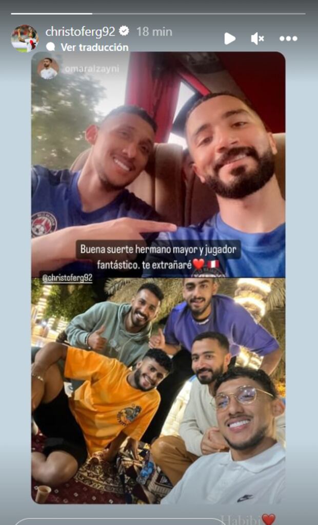 Unos momentos después, Omar Al-Zayni, jugador saudí de Al Adalah, publicó dos fotos junto a Christofer en sus historias de Instagram. Ambas instantáneas demuestran la confianza y amistad que tienen los deportistas. “Buena suerte, hermano mayor y jugador fantástico. Te extrañaré”, fueron las palabras del futbolista de 27 años.