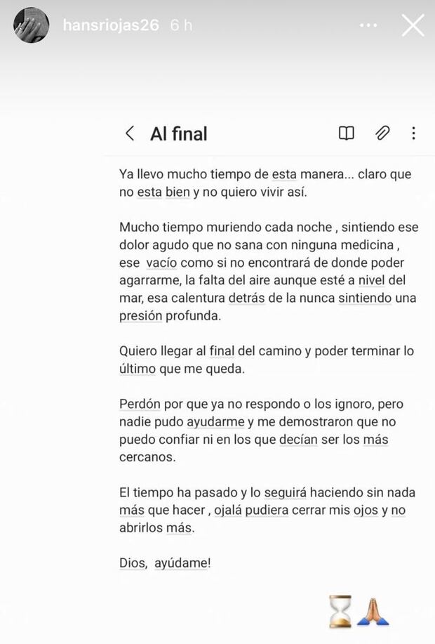 “Ya llevo mucho tiempo de esta manera. Claro que no está bien y no quiero vivir así”, inicia el mensaje de Hansell Riojas. “Mucho tiempo muriendo cada noche, sintiendo ese dolor agudo que no sana con ninguna medicina, ese vacío como si no encontrara de dónde poder agarrarme, la falta de aire aunque esté a nivel del mar, esa calentura detrás de la nuca sintiendo una presión profunda”, añade.