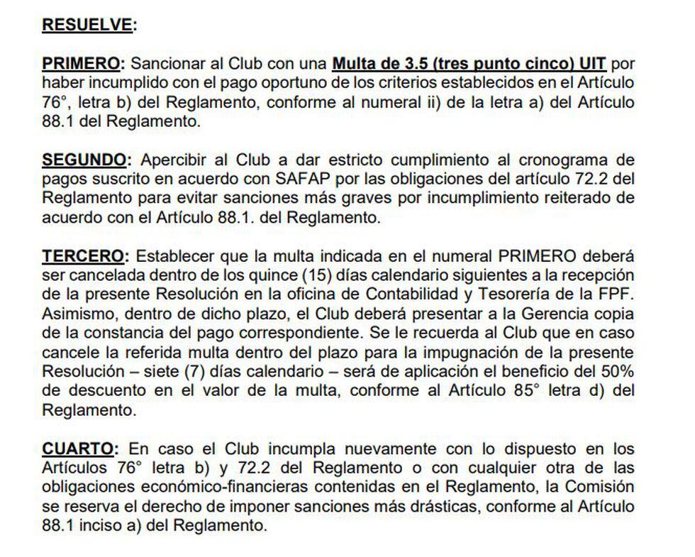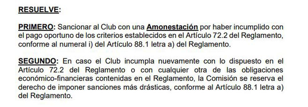 La Comisión de Licencia, mediante Resolución N° 0008 – CCL – 2020 , amonestó a la Academia Cantolao por no pagar a tiempo la CTS, aun cuando se les advirtió. Por otro lado, Carlos A. Mannucci no realizó el pago oportuno de las cuotas sindicales a la SAFAP, motivo por el cual la Comisión de Licencias de la FPF los amonestó, tal y como se indica en la Resolución N° 0007 – CCL – 2020. Además, de incurrir de nuevo en falta, la sanción será mayor.