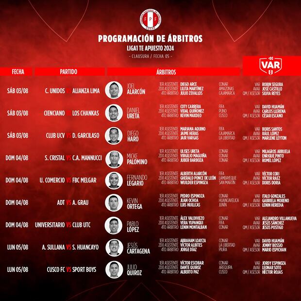 Este fin de semana se disputará la quinta jornada del Torneo Clausura 2024 y poco a poco vamos conociendo a los clubes que tienen serios argumentos para meterse en los play-offs de la Liga 1. Universitario de Deportes, Melgar, Sporting Cristal y Alianza Lima parten con relativa ventaja, pero todo puede suceder de aquí hasta que comience la recta final del campeonato. En tal sentido, en esta nota presentaremos a los árbitros que dirigirán los compromisos de esta fecha 5, confirmados por la Comisión Nacional de Árbitros (CONAR).