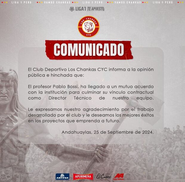 ¡En fila india! A falta de solo cinco fechas para que finalice el Clausura, se suma una nueva salida de un entrenador de un club peruano. Este miércoles por la tarde, Los Chankas confirmaron la salida de Pablo Bossi como DT, a pocos días de enfrentar a Deportivo Garcilaso (el domingo en Andahuaylas). El uruguayo, que llegó en abril, se marcha sin conocer la victoria en los últimos cinco partidos que estuvo al mando en esta segunda parte del torneo. Asimismo, Depor pudo conocer que la dirigencia de la escuadra del Sur, a pesar de haber llegado a un acuerdo para la salida de Bossi, le indicó a su comando técnico que desea contar con sus servicios pero aún sigue en negociaciones.