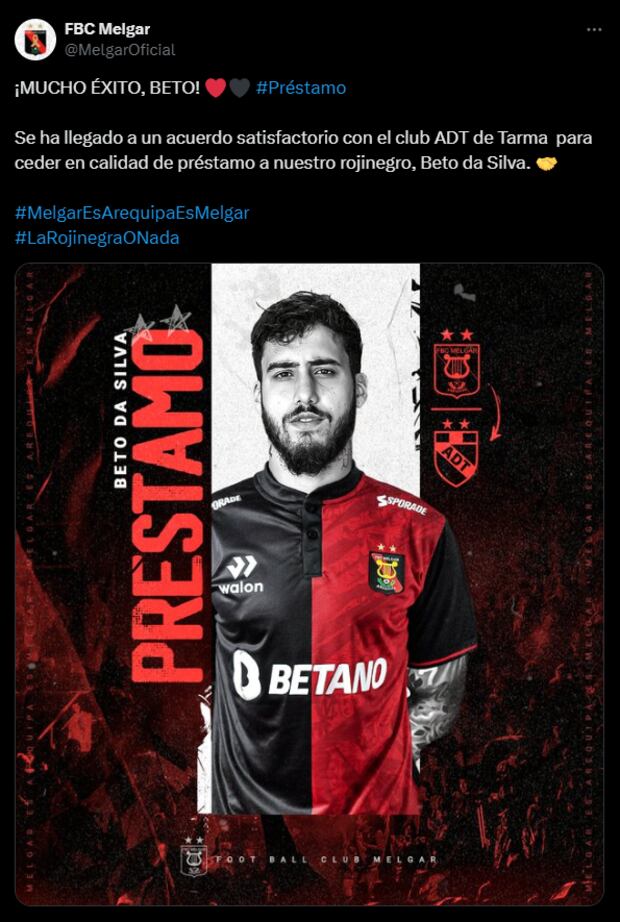 “Se ha llegado a un acuerdo satisfactorio con el club ADT de Tarma para ceder en calidad de préstamo a nuestro rojinegro, Beto da Silva”, escribió el club arequipeño en sus redes sociales, con la imagen del jugador, quien llegó a tienda rojinegra a mediados del 2023, luego de estar por dos temporadas y media en César Vallejo (dos años a modo de préstamo y medio año como jugador libre).