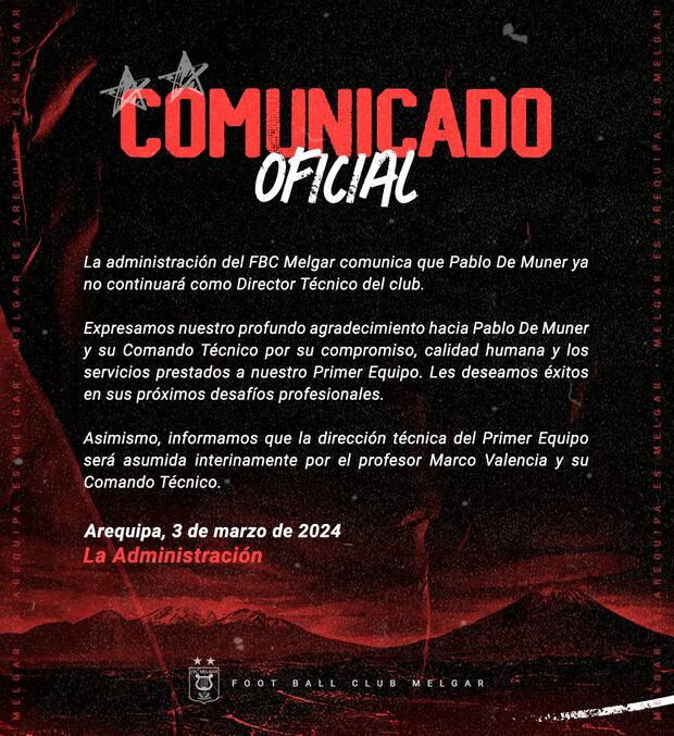 “La administración del FBC Melgar comunica que Pablo De Muner ya no continuará como Director Técnico del club”, apuntó Melgar en un comunicado. “Expresamos nuestro profundo agradecimiento hacia Pablo de Muner y su Comando Técnico por su compromiso, calidad humana y los servicios prestados a nuestro Primer Equipo. Les deseamos los éxitos en sus próximos desafíos profesionales”, agregó.