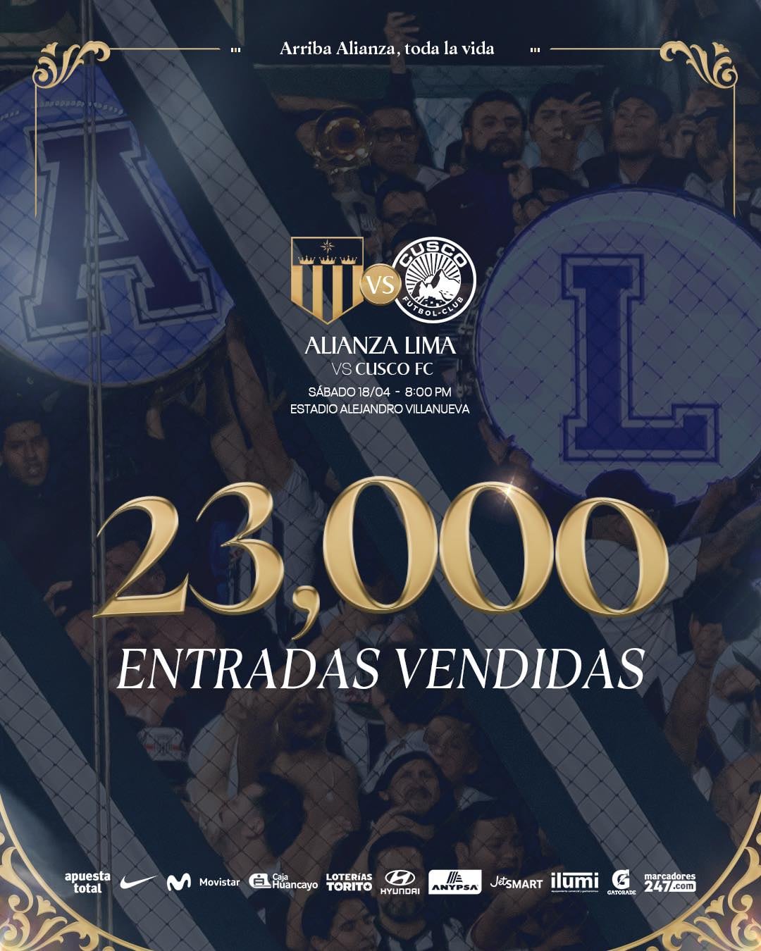 Por otro lado, Alianza Lima inició la venta de entradas para su partido ante Cusco FC el próximo sábado 18 de abril desde las 8:00 p.m. en el estadio Alejandro Villanueva. Hasta la tarde de este lunes ya se han vendido más de 23 mil entradas, según reporte oficial.