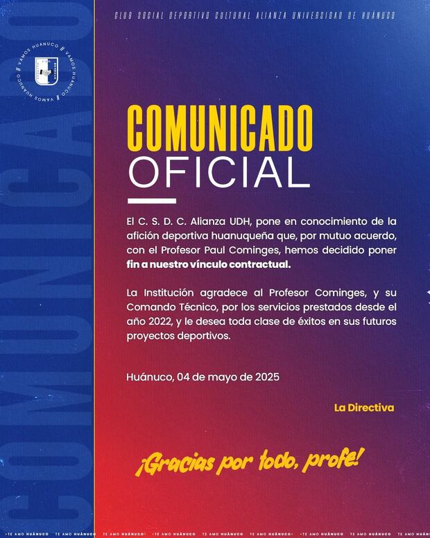 “Alianza Universidad pone en conocimiento de la afición deportiva huanuqueña que, por mutuo acuerdo con Paul Cominges, hemos decidido poner fin a nuestro vínculo contractual. La institución agradece al profesor Cominges y su comando técnico, por los servicios prestados desde el año 2022, y le desea toda clase de éxitos en sus futuros proyectos deportivos”, se lee en el comunicado.
