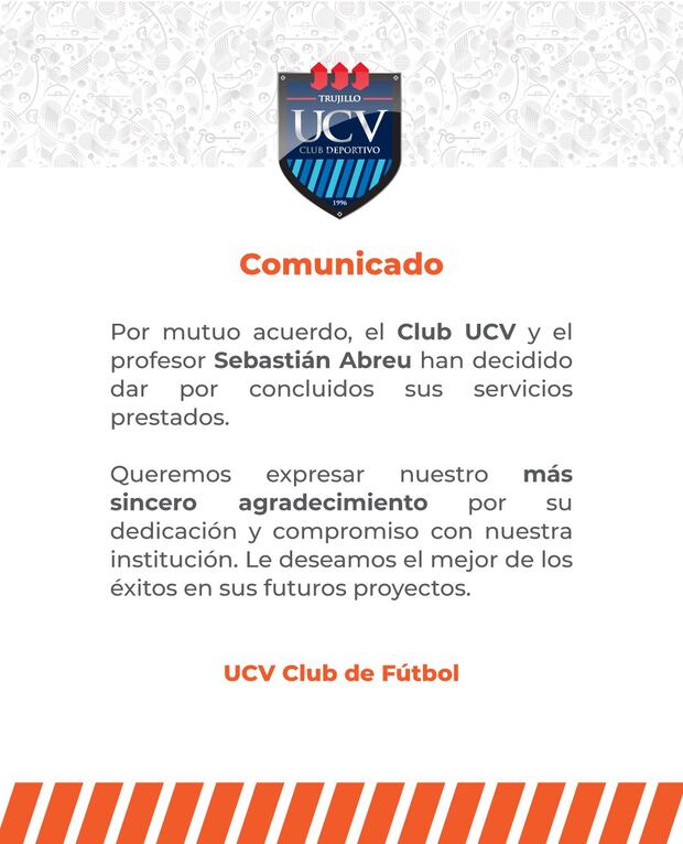 “Por mutuo acuerdo, el Club UCV y el profesor Sebastián Abreu han decidido dar por concluido sus servicios prestados. Queremos expresar nuestro más sincero agradecimiento y compromiso con nuestra institución. Le deseamos el mejor de los éxtiso en sus futuros proyectos”, se lee en el comunicado.