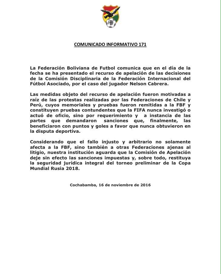 A través de un comunicado difundido en Twitter, la FBF sostuvo que el primer fallo fue injusto pues el máximo ente del fútbol aceptó las pruebas de las federaciones de Perú y Chile, pero nunca hizo una investigación o actuó de oficio.