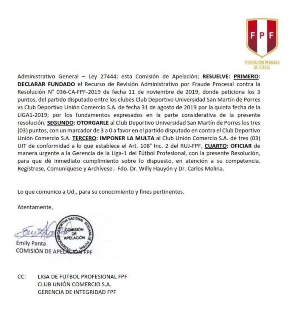 En ese sentido, la instancia encargada del caso resolvió fundado el pedido de los ‘Santos’, restándole así a los moyobambinos una victoria. “Esta Comisión de Apelación resuelve [...] otorgarle a Universidad San Martín los tres puntos, con un marcador de 3 a 0 a favor en el partido disputado en contra de Unión Comercio”, menciona la resolución emitida al mediodia.