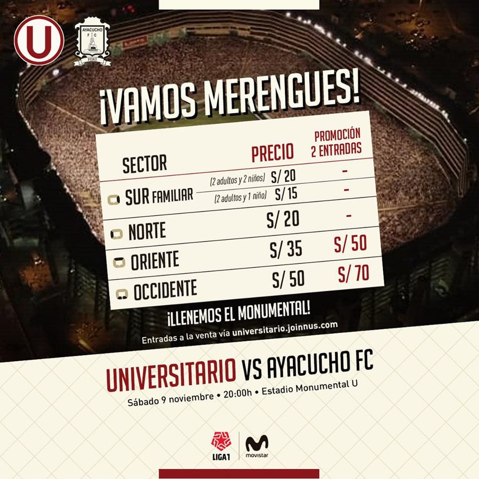 Universitario de Deportes necesita tres puntos para no perder el paso en el Torneo Clausura. El equipo de Ángel Comizzo juega en casa y el aliento de la hinchada será clave para seguir en carrera. Los boletos ya están a la venta y se espera que el Monumental luzca lleno para meter presión a Ayacucho FC, el rival de turno.