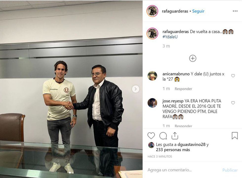 “El jugador Rafael Guarderas es nuevo jugador de Universitario. ¡Bienvenido de vuelta a casa, Rafa!”, escribieron los merengues para referirse a la primera incorporación en la segunda etapa de Ángel Comizzo.