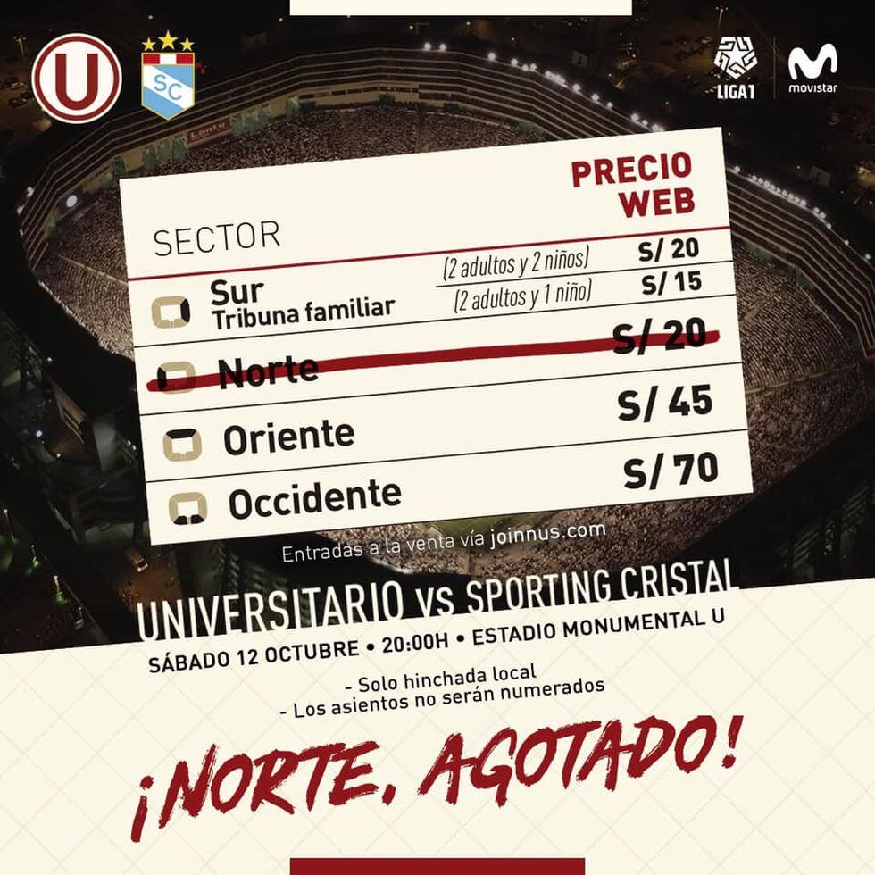 Universitario vs. Sporting Cristal contará con un importante marco para el enfrentamiento entre ambas escuadras de esta noche en el estadio Monumental de Ate. Según confirmó la administración crema, los boletos para la tribuna popular norte se agotaron, por lo que se sentirá la localía merengue.