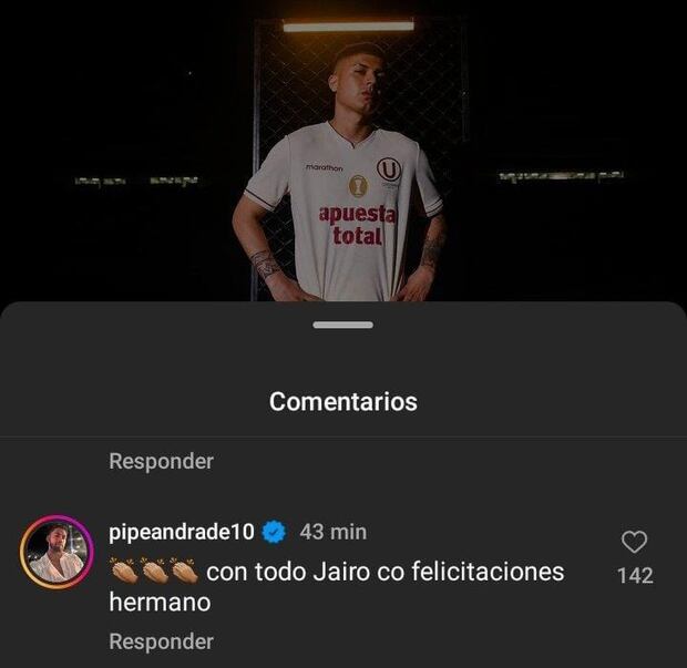 “Con todo ‘Jairoco’, felicitaciones, hermano”, comentó el ‘cafetero’ en una publicación del citado futbolista ‘crema’. En dicha fotografía en la mencionada red social, Concha se refirió a su arribo a la ‘U’: “Llegar a Universitario es para mí un suelo hecho realidad. Tomo este gran paso con mucho responsabilidad y gratitud”, escribió.