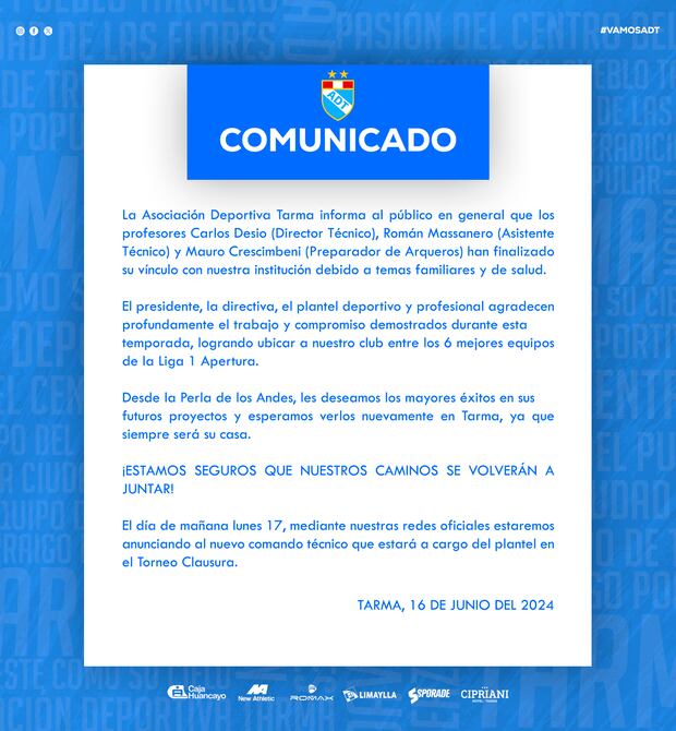 Debido a temas personales, Carlos Desio no continuará en ADT. El club tarmeño -a través de sus redes sociales- dio a conocer la noticia. “El presidente, la directiva, el plantel deportivo y profesional agradecen profundamente el trabajo y compromiso demostrados durante esta temporada, logrando ubicar a nuestro club entre los seis mejores equipos de la Liga1 Apertura”, apuntaron.