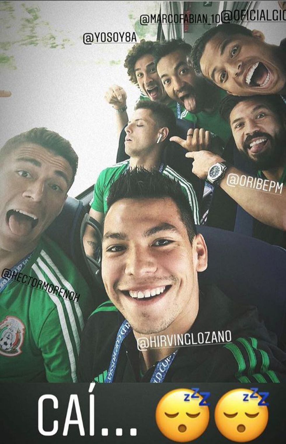 El 'Chicharito' se durmió en el bus camino al aeropuerto. De eso se aprovecharon sus compañeros para tomarse una foto grupal con él, la misma que colgaron en sus redes sociales. Hasta la misma cuenta del 'Tri' compartió la gráfica.