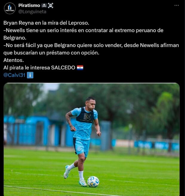 “ATENTOS!! Conté en Dex3 por @SomosRosarioOK que Newell’s tiene en el radar a BRYAN REYNA, extremo de Belgrano. No es fácil que salga de Belgrano pero el interés está”, publicó el periodista argentino Gonzalo Calvigioni en su cuenta de ‘X’.