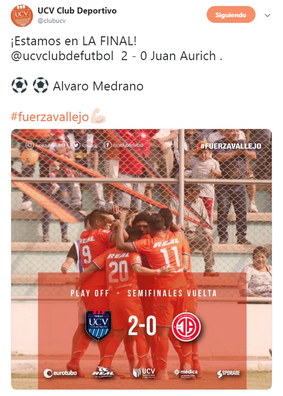 La Cesar Vallejo está a un solo paso de volver a la máxima división del fútbol peruano. El cuadro 'poeta' logró, en casa, revertir el marcador frente a Juan Aurich y ahora será uno de los finalistas de Segunda División.