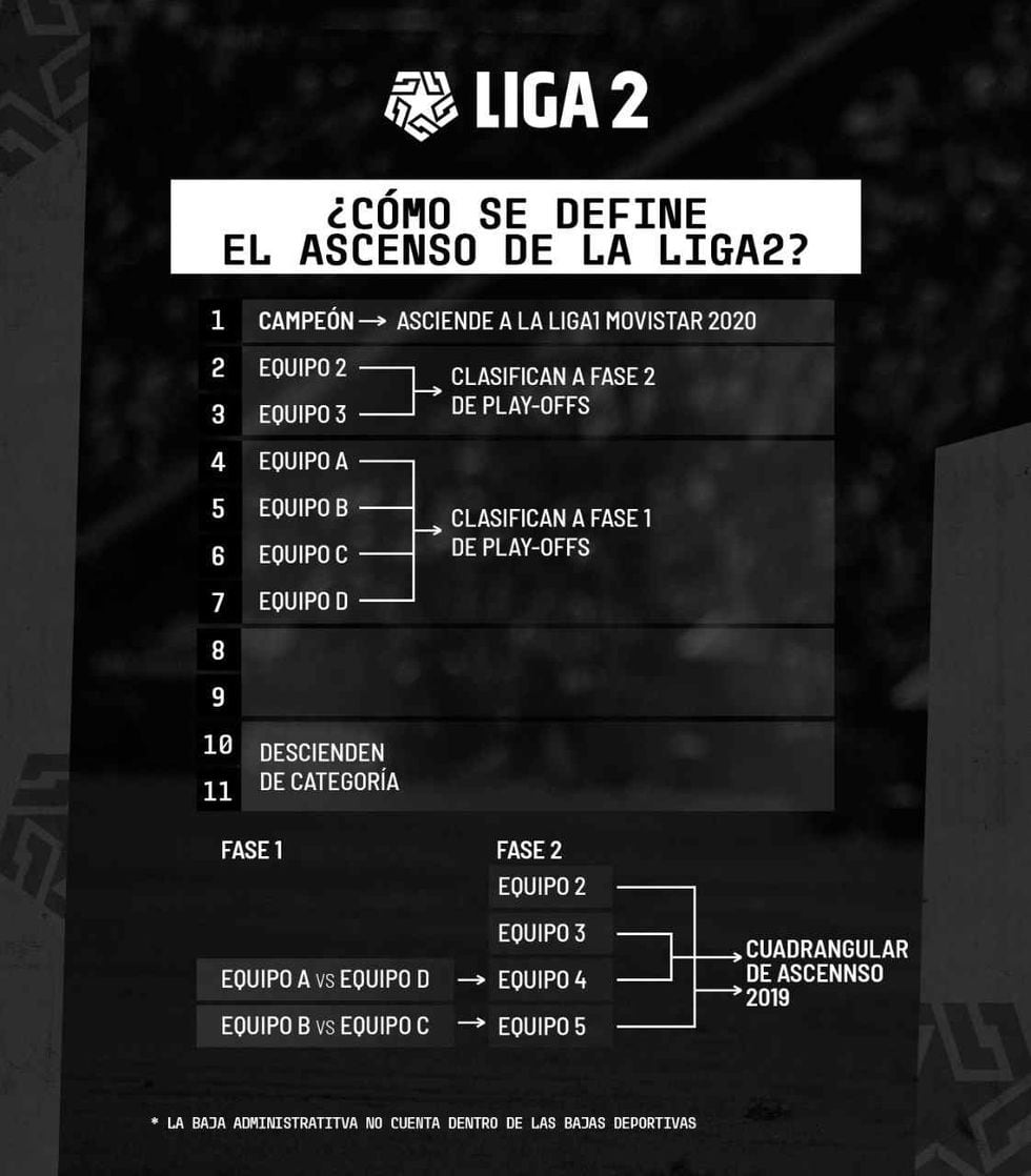 Mientras los clubes ubicados entre el segundo y séptimo de la tabla disputarán partidos de eliminación directa para ir al cuadrangular del ascenso 2019, que también incluirá equipo de la Copa Perú.