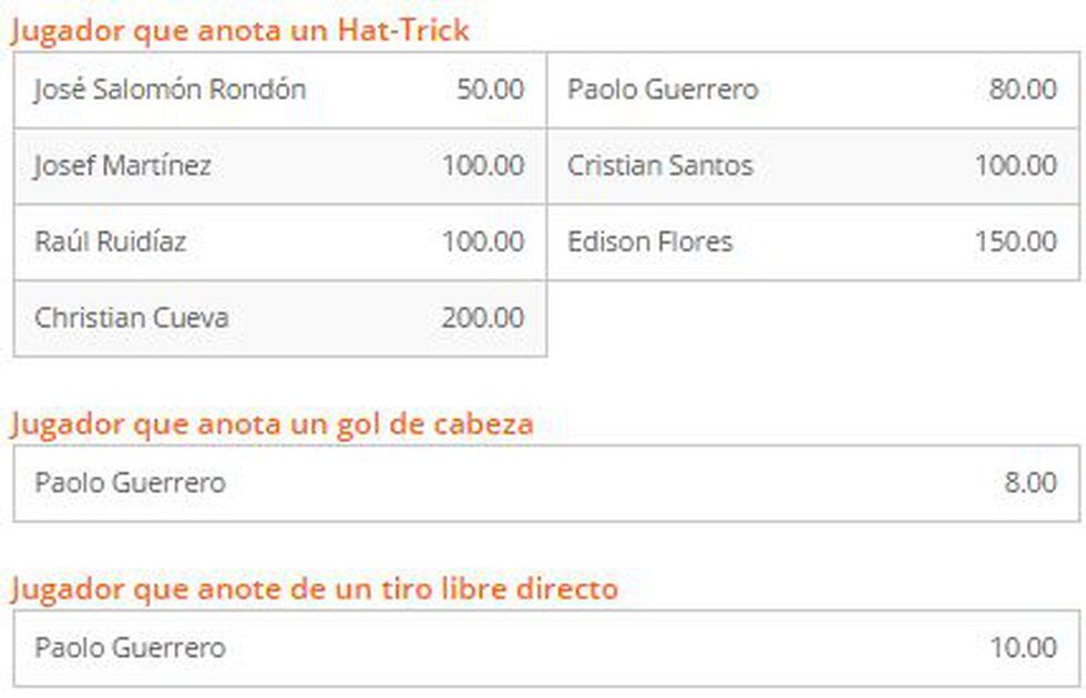 De igual forma el gol de tiro libre de Paolo Guerrero tiene un valor de 10.00 y su hat-trick de 80.00.