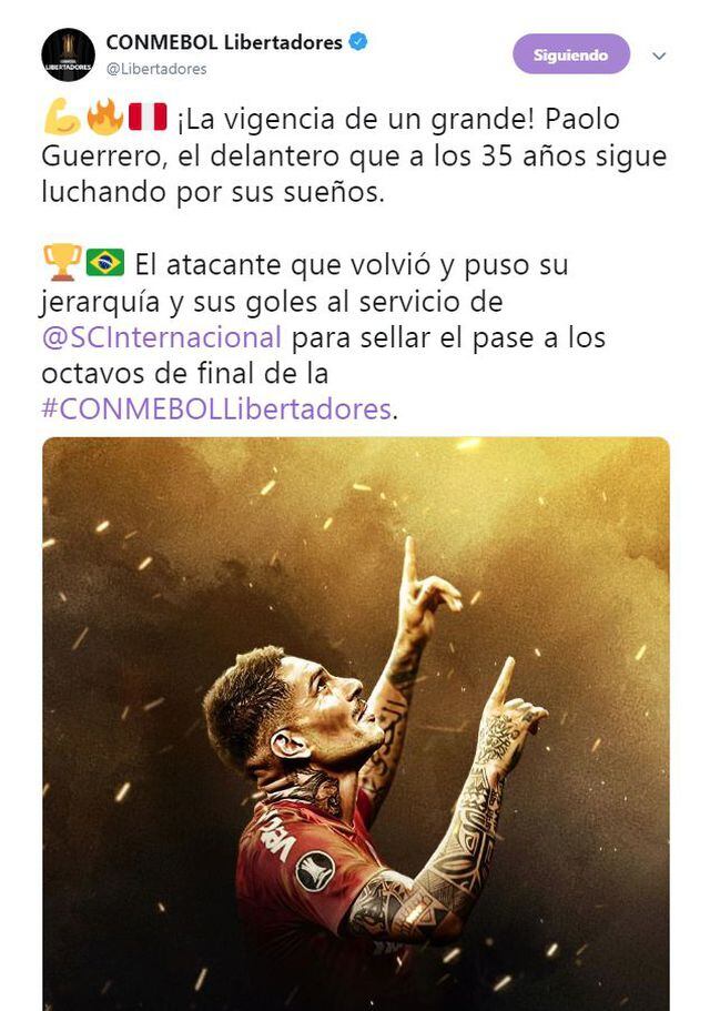 "¡La vigencia de un grande! Paolo Guerrero, el delantero que a los 35 años sigue luchando por sus sueños", escribió la Conmebol en sus redes sociales.
