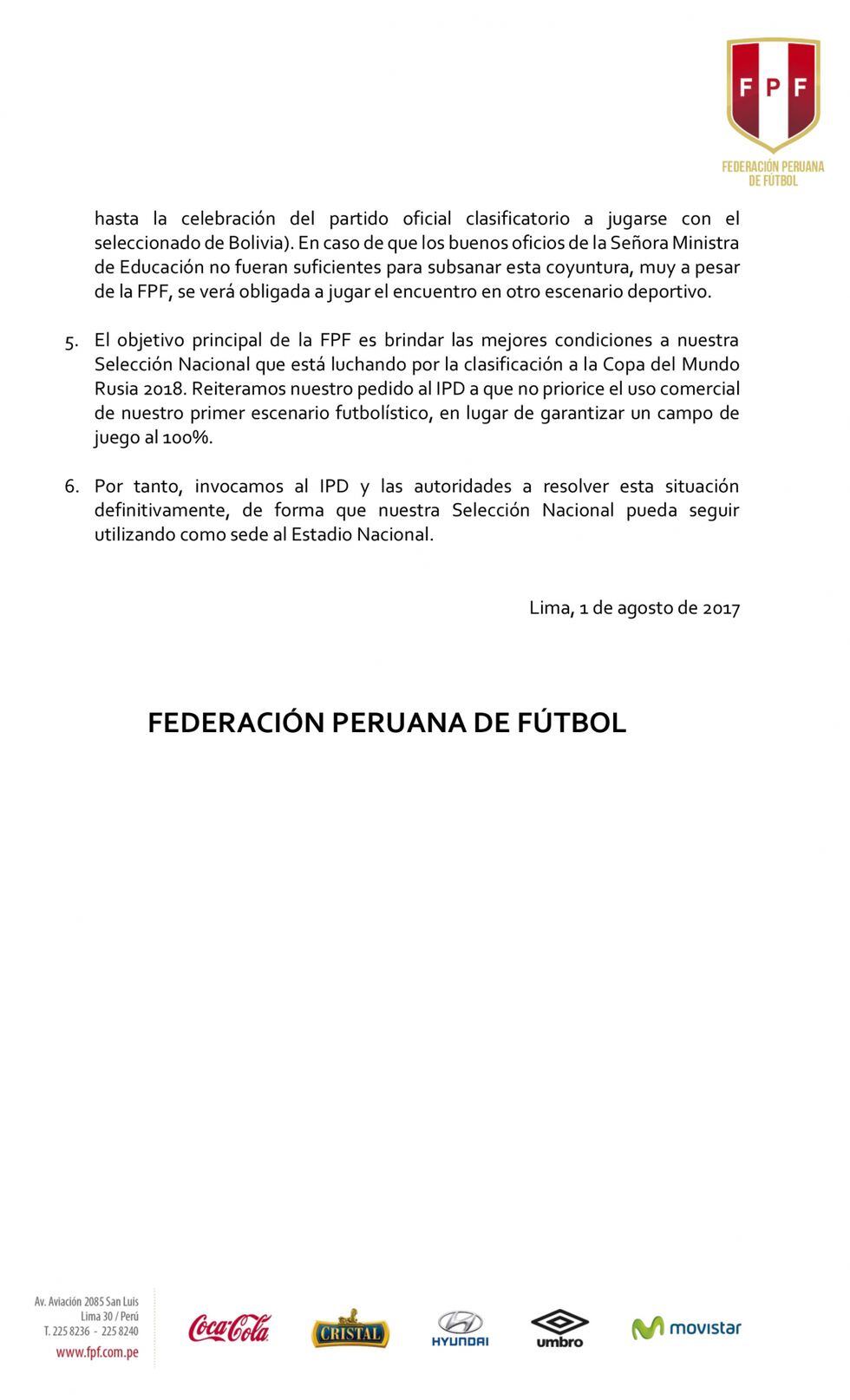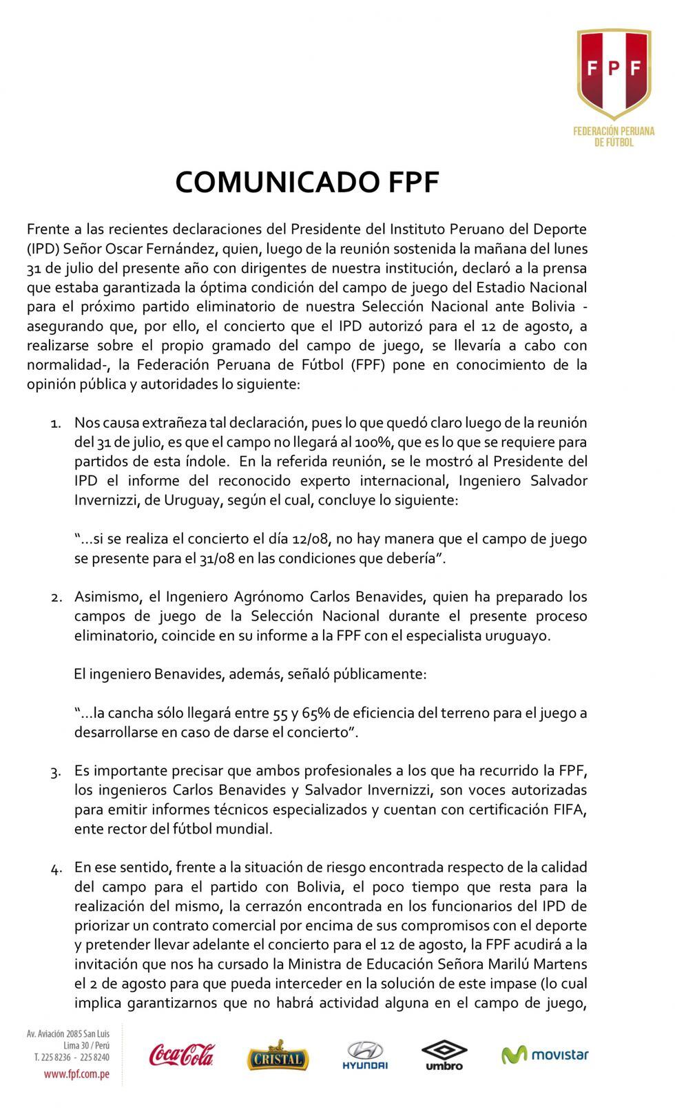 Además, en dicho comunicado , la FPF mostró extrañeza a las declaraciones del presidente del IPD Oscar Fernández quien se mantuvo firme en señalar que el estadio llegará en óptimas condiciones cuando en "la reunión del 31 de julio, se informó es que el campo no llegará al 100%, que es lo que se requiere para partidos de esta índole".