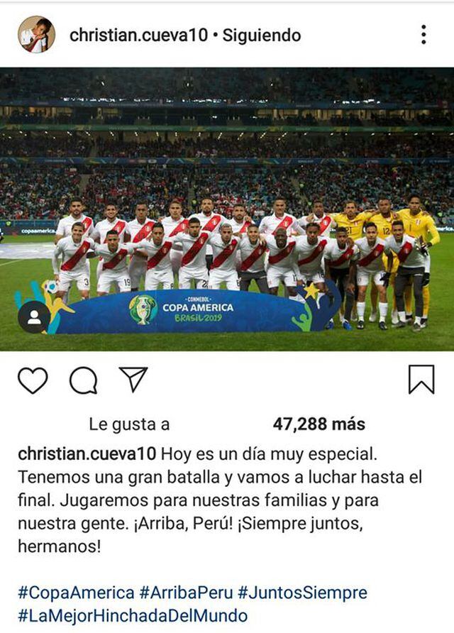 "Hoy es un día muy especial. Tenemos una gran batalla y vamos a luchar hasta el final. Jugaremos para nuestras familias y para nuestra gente. ¡Arriba, Perú! ¡Siempre juntos, hermanos!", publicó Cueva en su cuenta oficial.