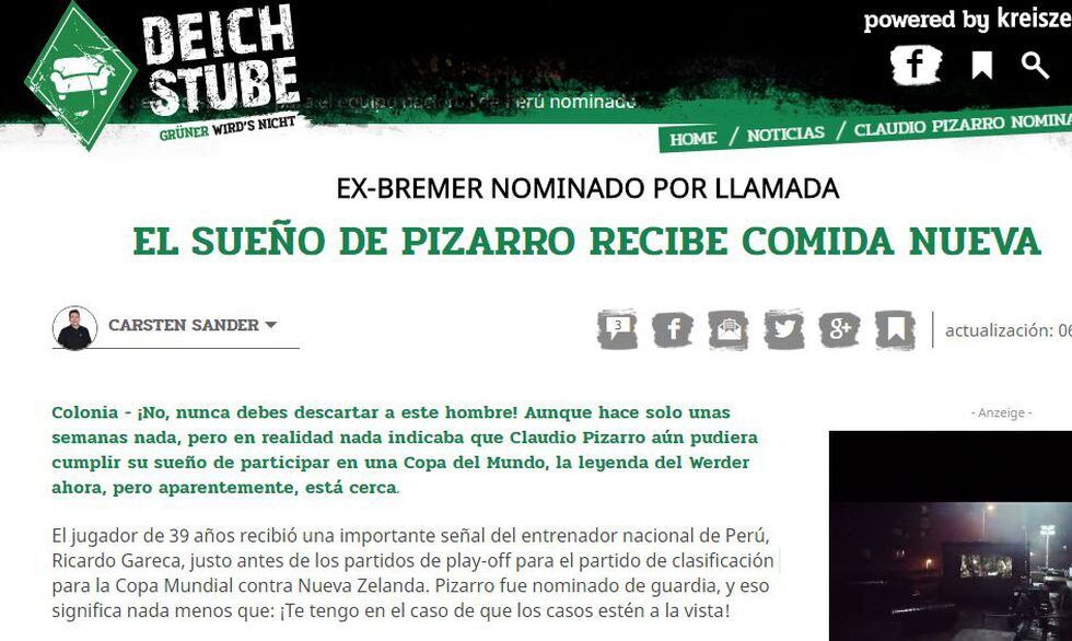 "El jugador de 39 años recibió una importante señal del entrenador nacional de Perú, Ricardo Gareca, justo antes de los partidos de play-off para el partido de clasificación para la Copa Mundial contra Nueva Zelanda. Pizarro fue nominado de guardia, y eso significa nada menos que: ¡Te tengo en el caso de que te necesite!", apuntó Deichstube.