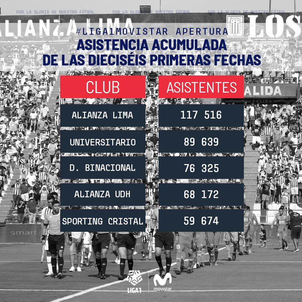 Alianza Lima y Universitario de Deportes siguen liderando la Tabla del Hincha, acumulado de la Liga 1 que reúne la asistencia de aficionados en las 16 fechas del Torneo Apertura. Binacional también está en el top 5.