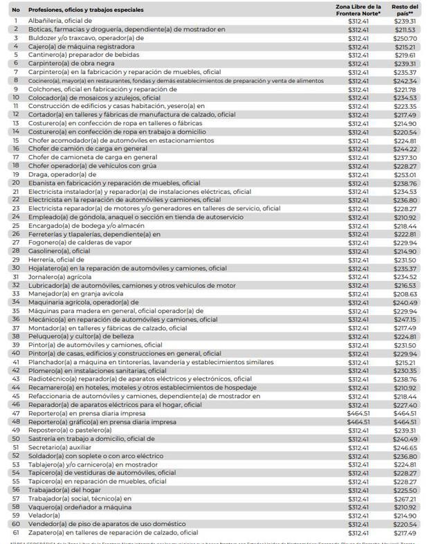 En la región fronteriza, todos los trabajos pagarán un salario de $312.41, sin excepción. Sin embargo, en otras áreas del país, los montos salariales difieren según el oficio. Por ejemplo, en diferentes regiones de la República, un albañil ganará $239.31, mientras que un conductor de camión de carga general percibirá $244.22.