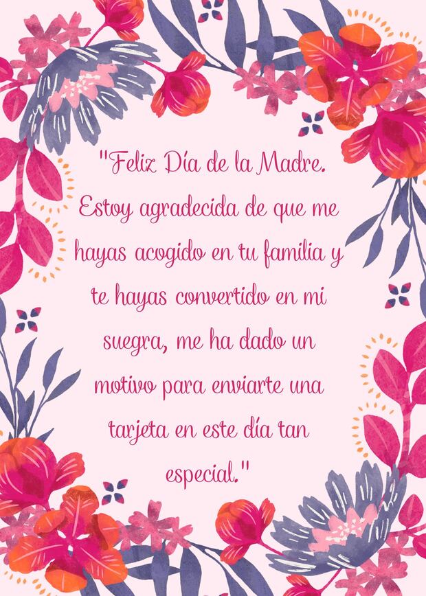 - 68. “Feliz Día de la Madre. Estoy agradecida de que me hayas acogido en tu familia y te hayas convertido en mi suegra, me ha dado un motivo para enviarte una tarjeta en este día tan especial.”