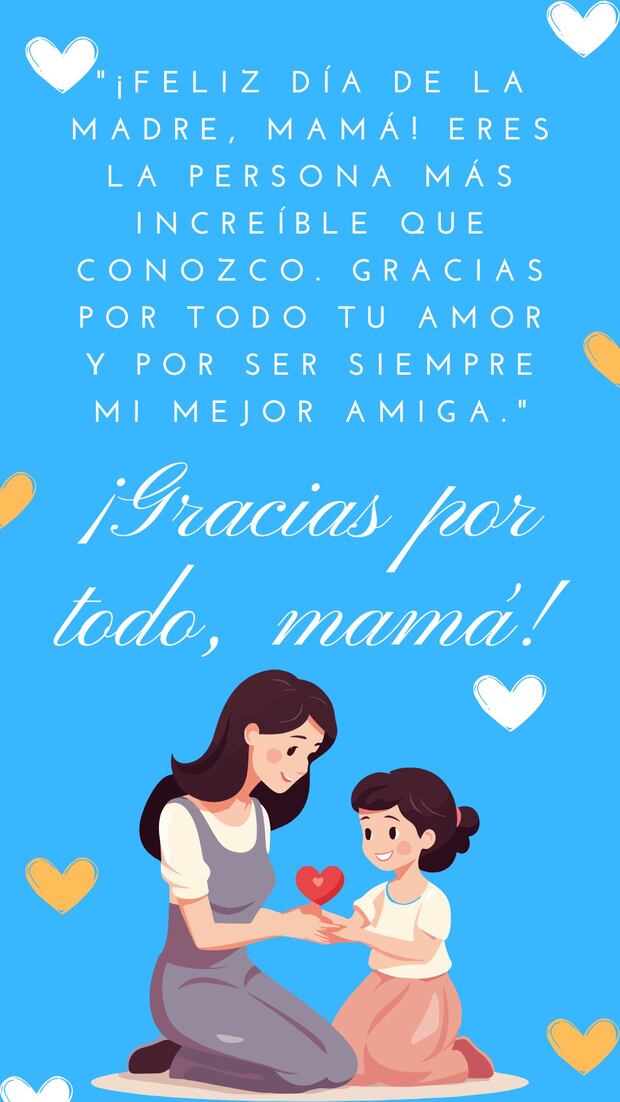 - 21. “¡Feliz Día de la Madre, mamá! Eres la persona más increíble que conozco. Gracias por todo tu amor y por ser siempre mi mejor amiga.”