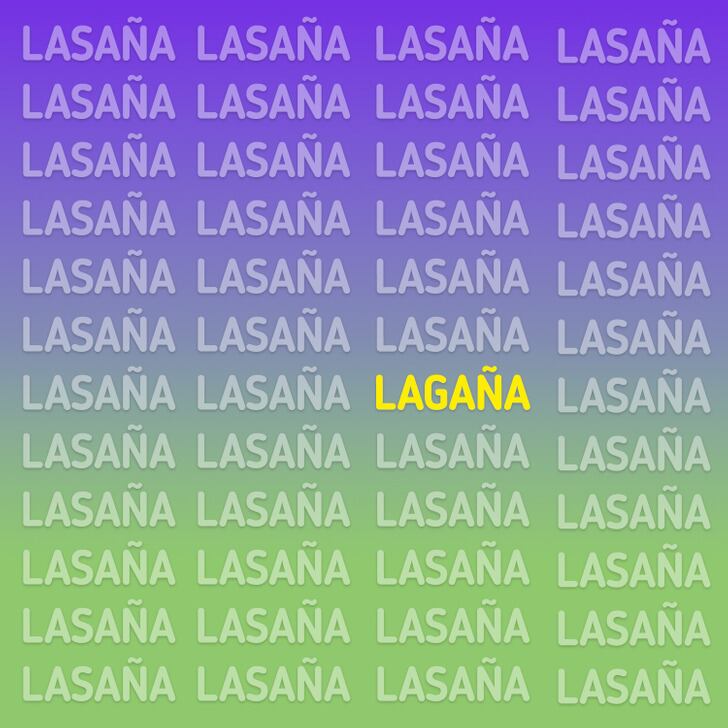 Sin mucho más que agregar, te cuento que la palabra ‘LAGAÑA’ se encuentra más cerca de lo que imaginas. Mira nuevamente la imagen. ¿Puedes decirme qué lees en la séptima fila de la tercera columna? Efectivamente, a diferencia de lo que se observa en toda la gráfica, ahí no dice ‘LASAÑA’. No obstante, es normal que muchas personas lo pasaran por alto fácilmente.