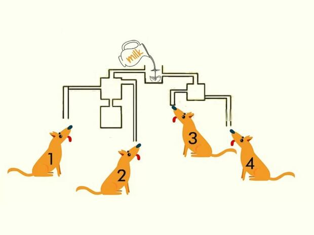 ¡Enhorabuena si has sido capaz de resolver este misterio correctamente! Pero si aún te preguntas cuál de estos traviesos caninos será el primero en beber la leche, aquí tienes la respuesta: si te fijas bien, verás que cada tubería tiene un obstáculo en algún punto. Como resultado, solo el valiente perro número 2 tiene el honor de ser el primero en probar el lechoso líquido.