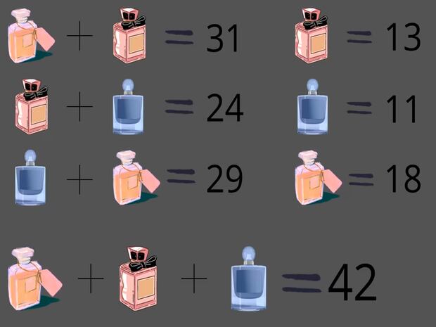 Perfume rosa + perfume con lazo = 31. Tenemos que reemplazar por distintos números y llegamos a la conclusión que el primero equivale a 18 y el segundo a 13.
