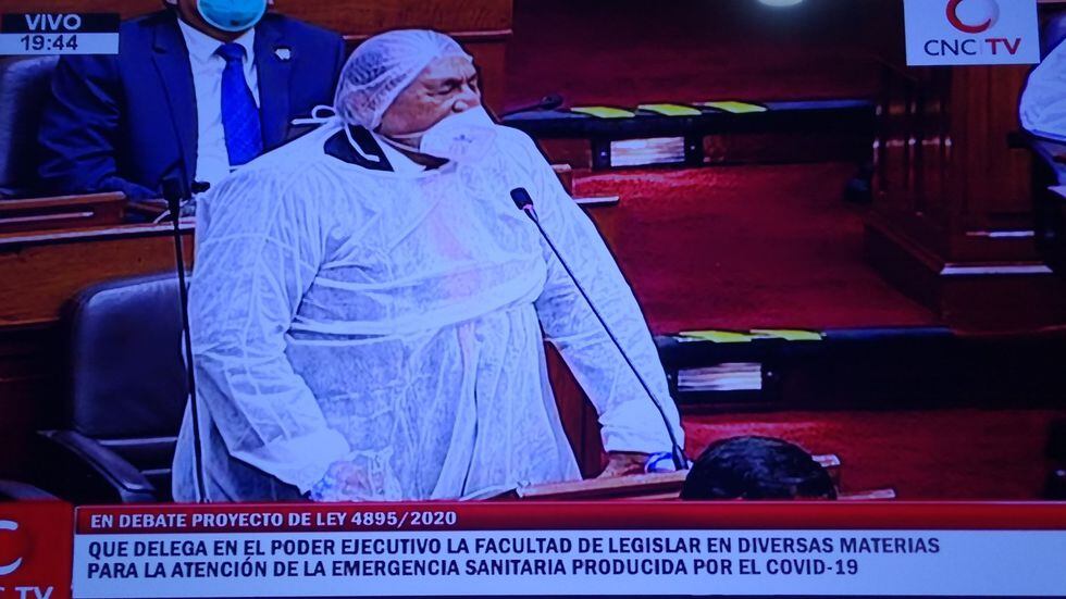 - Coronavirus en Perú | El congresista por Tumbes, Napoleón Puño, acudió al pleno totalmente cubierto, como medida de protección contra el COVID-19.