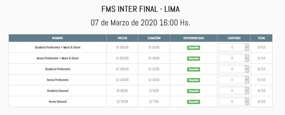 Tal y como se puede observar en la siguiente imagen, el valor de los tickets para la última parada de la FMS Internacional oscila entre los 77 y 270 soles, incluida la comisión por la compra, que podrá realizarse a través de la página web oficial del evento. Asimismo, la distribución se da de la siguiente manera: Gradería Preferente, Arena Preferente, Gradería General y Arena General.