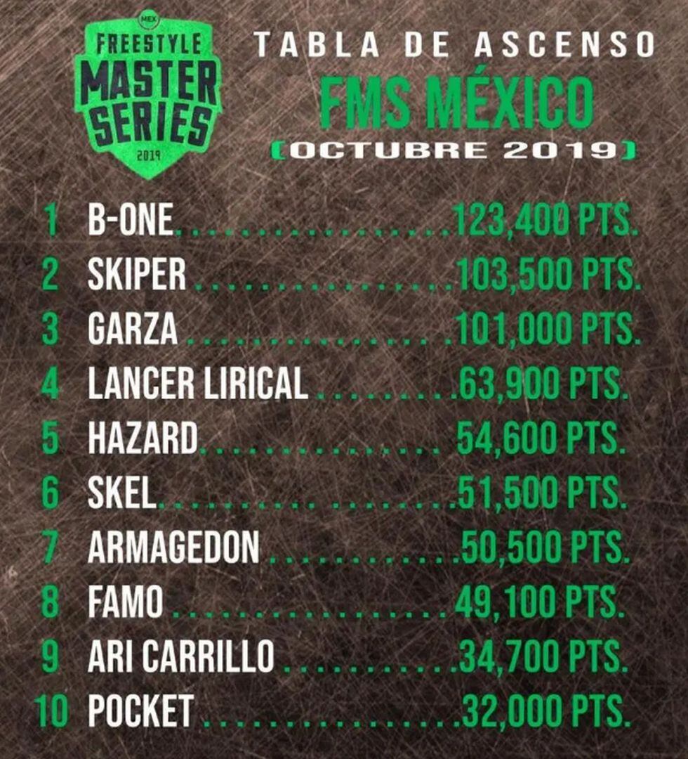 La tabla de clasificación para el ascenso a la FMS México ha dado un vuelco en octubre. Si Skiper parecía bien posicionado en lo alto del ranking, B-One, nuevo campeón de BDM Gold México 2019, le ha adelantado y se ha colocado como líder con 123.400 puntos.
