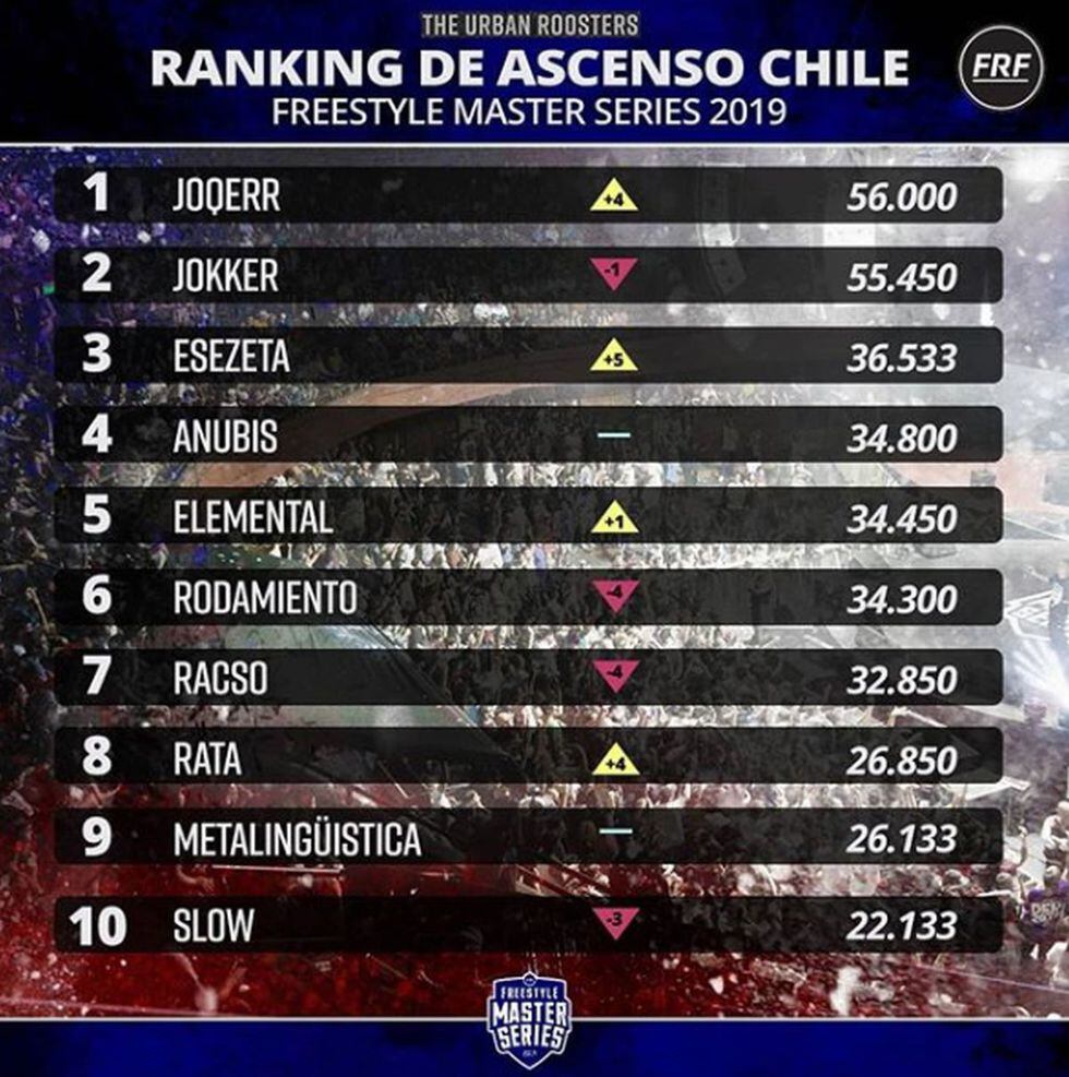 Con 56.000 puntos, Joqerr lidera la tabla de posiciones tras ser el más constante en las competencias de la Freestyle Rap Federation. En el segundo lugar, y con 55.450 puntos, se encuentra Jokker. La situación de Chile ha complicado las competencias en el país sureño, por lo que esta actualización es de finales de setiembre y primero días de octubre.