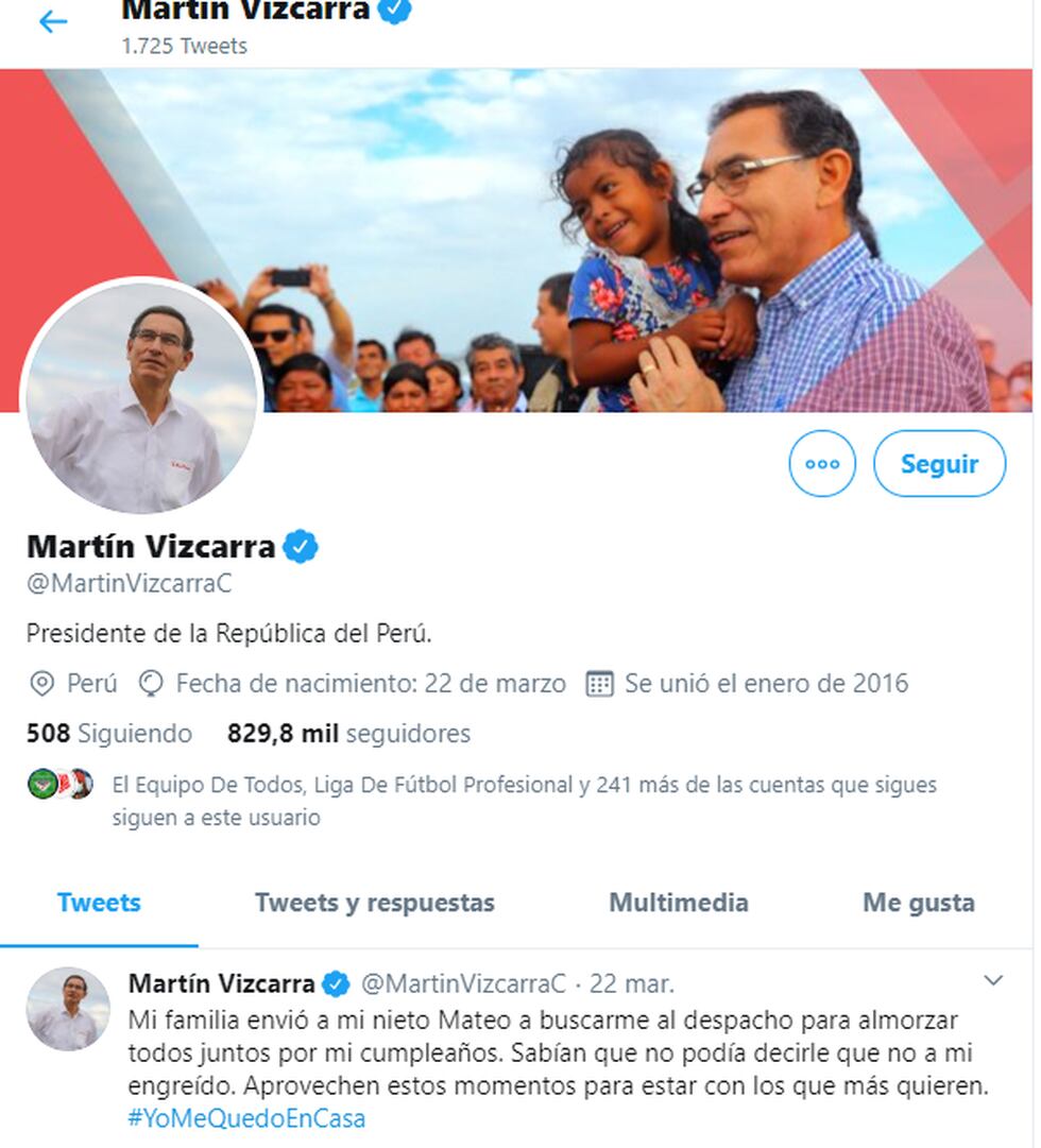 El Presidente de la República del Perú es un personaje activo en las redes sociales como Twitter y Facebook. El Jefe de Estado en tiempos del coronavirus ha usado en varias ocasiones su cuenta oficial para tuitear diferentes mensajes dirigidos a la población. Su cuenta oficial es: @MartinVizcarraC.