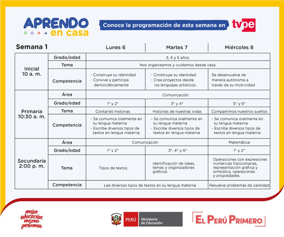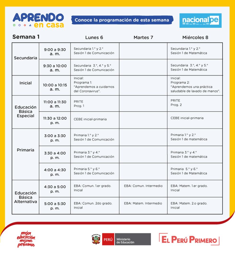 La programación realizada por el Ministerio de Educación y el IRTP comienza desde el lunes a viernes a partir de las 10:00 horas para el sector de inicial, 10:30 horas para los niños de primaria y finalmente a las 14:00 horas para todo el sector de secundaria.
