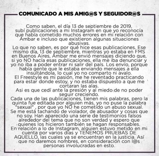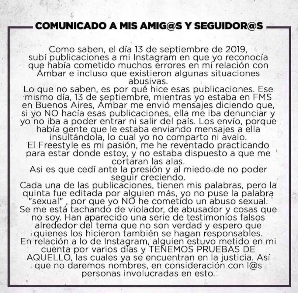 Luego, el chileno reveló por qué hizo esas publicaciones: “Ese mismo día, 13 de setiembre, mientras yo estaba en FMS en Buenos Aires, Ámbar me envió mensajes diciendo que, si yo no hacía esas publicaciones, ella me iba a denunciar y yo no iba a poder entrar ni salir del país. Los envío porque había gente que le estaba enviando mensajes a ella insutándola, lo cual yo no comparto ni avalo”.