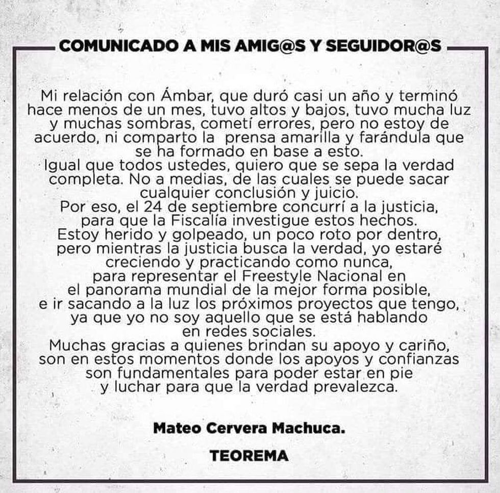 “Como saben, el día 13 de setiembre de 2019, subí publicaciones a mi Instagram en que yo reconocía que había cometido muchos errores en mi relación con Ámbar e incluso que existieron algunas situaciones abusivas”, señaló ‘Teo’ en un nuevo comunicado.