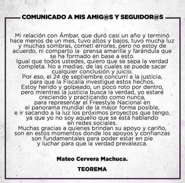 Asimismo, Mateo Cervera, señaló que el 24 se setiembre se presentó ante la justicia de su país para que se investigue el caso. “Estoy herido y golpeado, un poco roto por dentro, pero mientras la justicia busca la verdad, yo estaré creciendo y practicando como nunca, para representar el freestyle nacional en el panorama mundial”, dijo Teorema antes de concluir su comunicado agradeciendo a quienes le brindaron y brindan su apoyo.