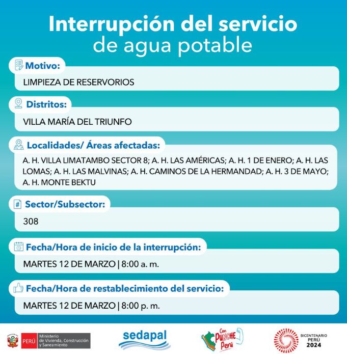 Ante esta situación, la población debe tomar precauciones para evitar contratiempos durante el día, especialmente si necesita bañarse, utilizar los servicios sanitarios o cocinar alimentos. Asimismo, y con el objetivo de informar a las personas sobre las precauciones necesarias, Depor ha elaborado este artículo que proporciona detalles sobre las zonas que sufrirán interrupción en el suministro de agua el martes 12 de marzo, así como los horarios previstos de la interrupción y el momento estimado de restablecimiento del servicio.