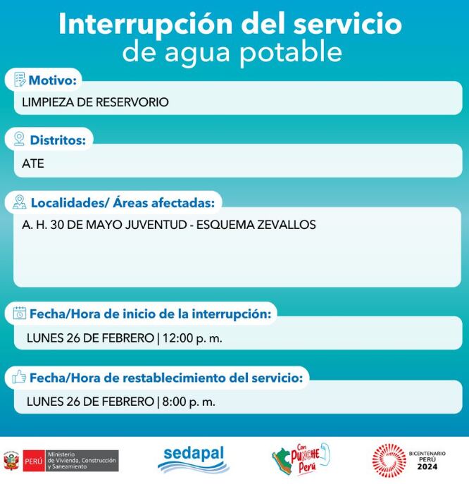 El Servicio de Agua Potable y Alcantarillado de Lima (Sedapal) es responsable de garantizar la provisión de agua potable y el servicio de alcantarillado en Lima y Callao en Perú. Sin embargo, por diferentes motivos, como obras de mantenimiento, averías y desinfección de reservorios, la empresa dio a conocer que en distintas partes de Lima Metropolitana habrá corte de agua este día. Entérate todo en los siguientes párrafos. A continuación, te detallamos los distritos afectados y cómo actuar antes, durante y después de la suspensión del servicio del lunes 26 de febrero de 2024.