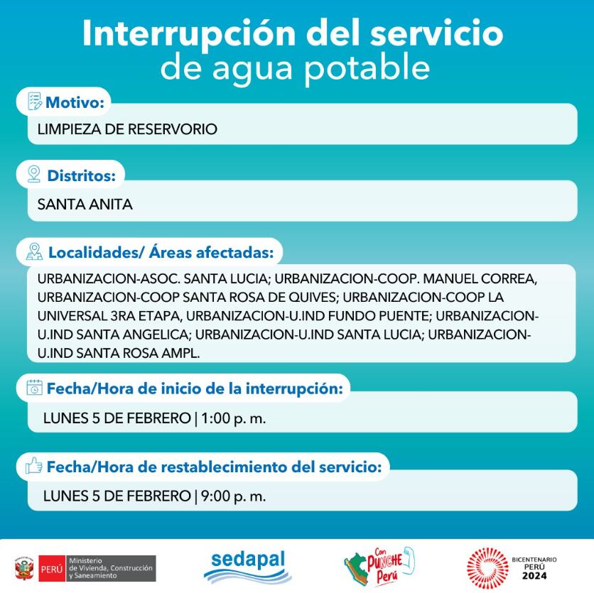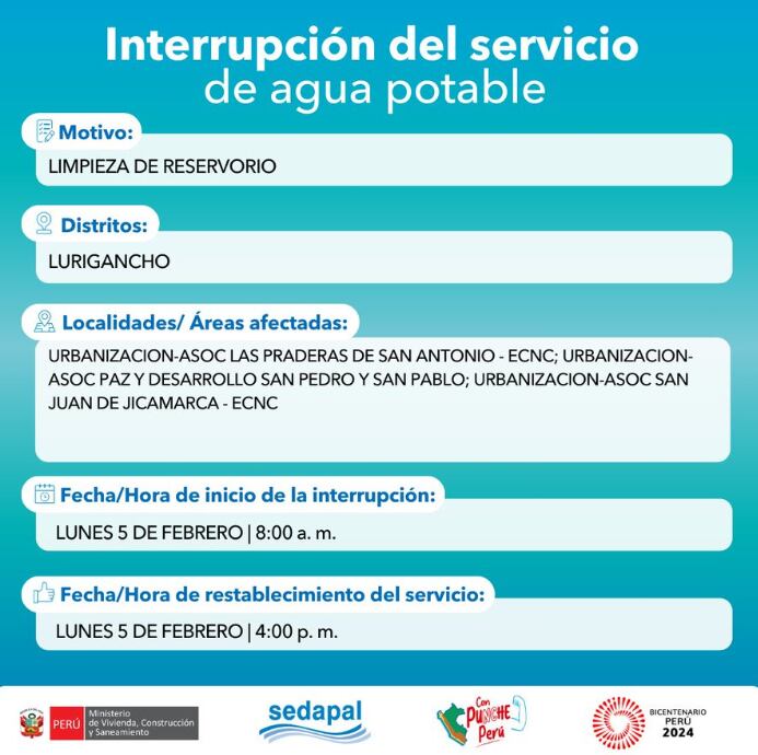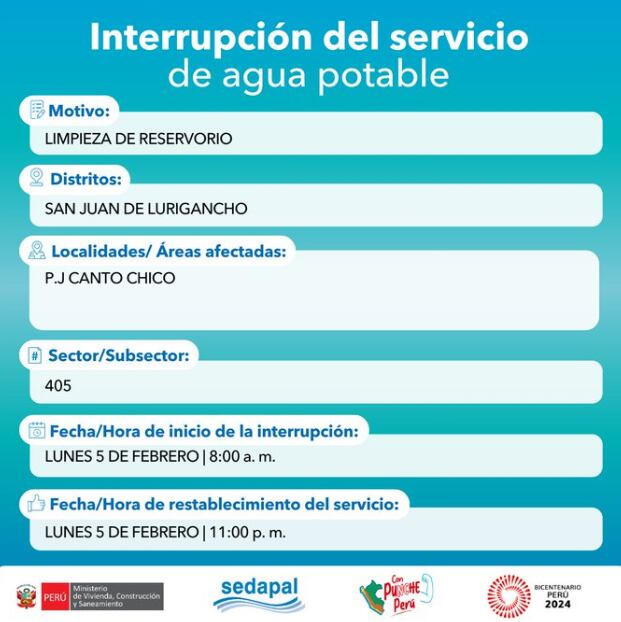 Este lunes 5 de enero, algunos distritos de Lima no van a tener agua. El motivo del corte del servicio es porque representantes del Servicio de Agua Potable y Alcantarillado de Lima (Sedapal) deben realizar trabajos de mantenimiento para que de esa forma puedan asegurarse que las tuberías y empalmes se encuentren en buen estado.