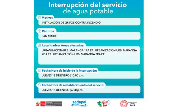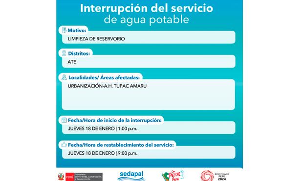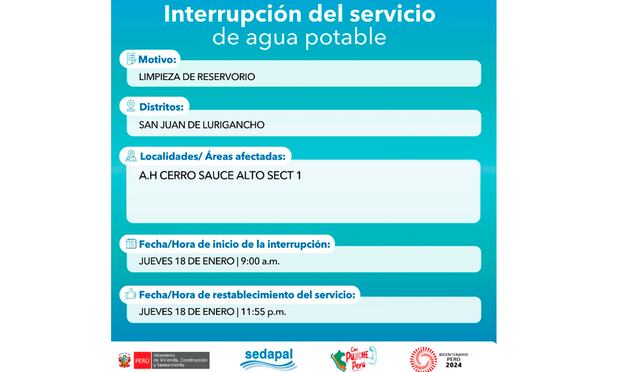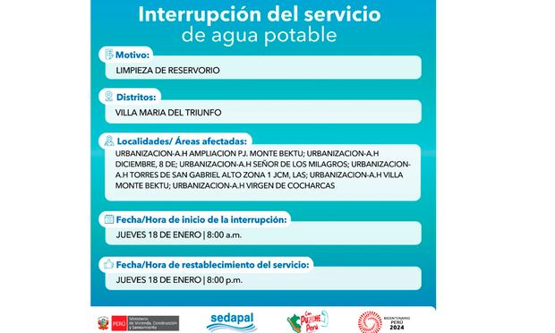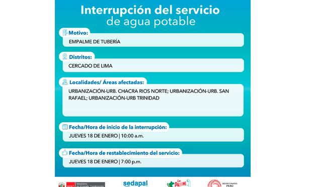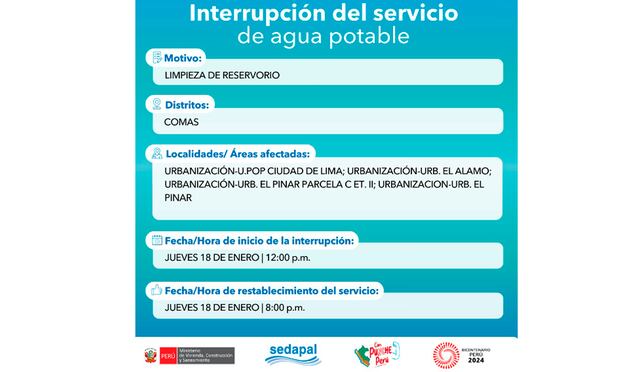 Para realizar estos trabajos, los colaboradores de la empresa deben cortar el agua para las revisiones del distrito elegido. Depor ha preparado esta nota con información sobre los distritos que no gozaron del servicio por algunas horas el jueves 18 de enero.
