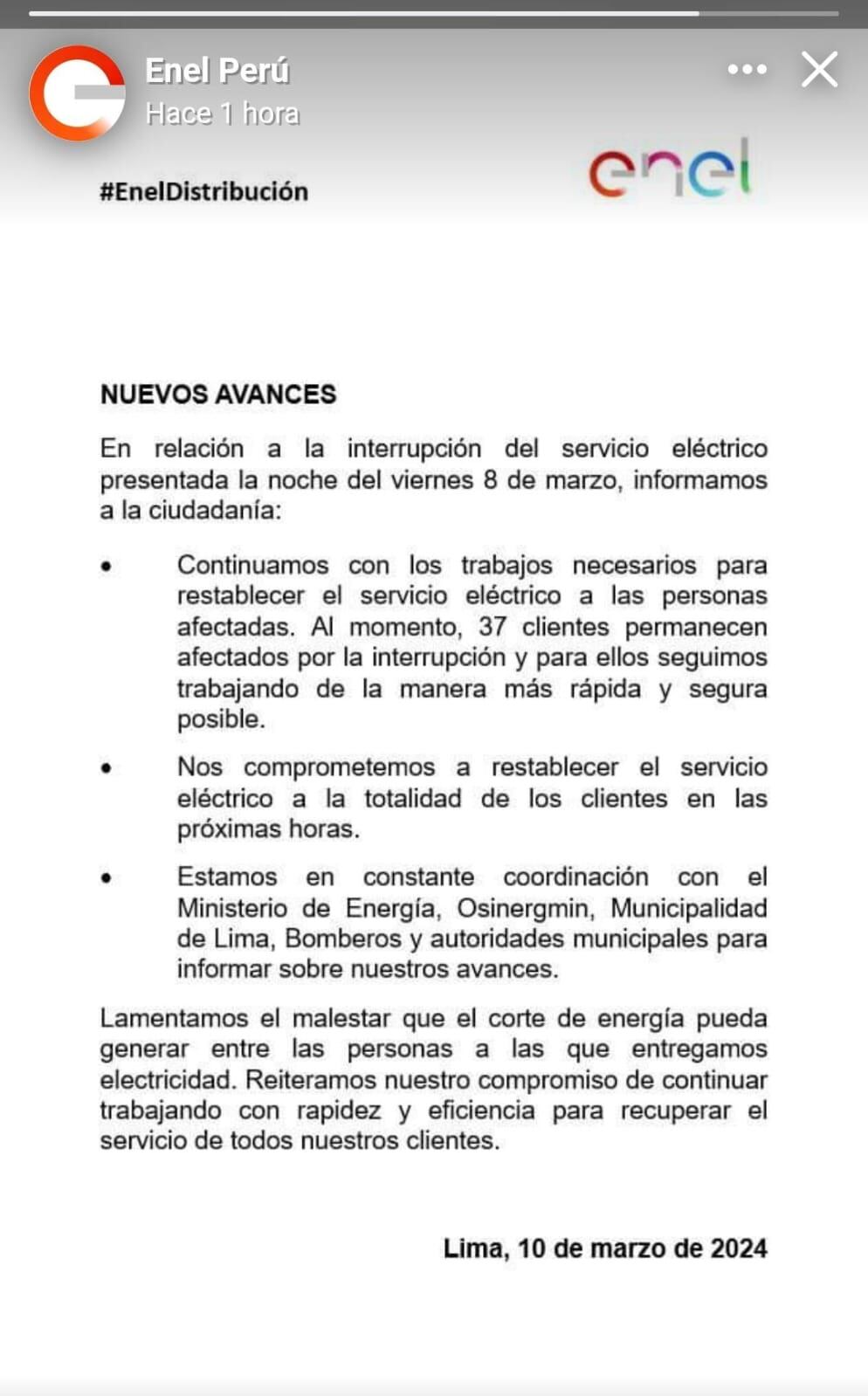 Asimismo, indicaron que están trabajando en “constante coordinación con el Ministerio de Energía, Osinergmin, Municipalidad de Lima, Bomberos y autoridades municipales para informar sobre nuestros avances”.