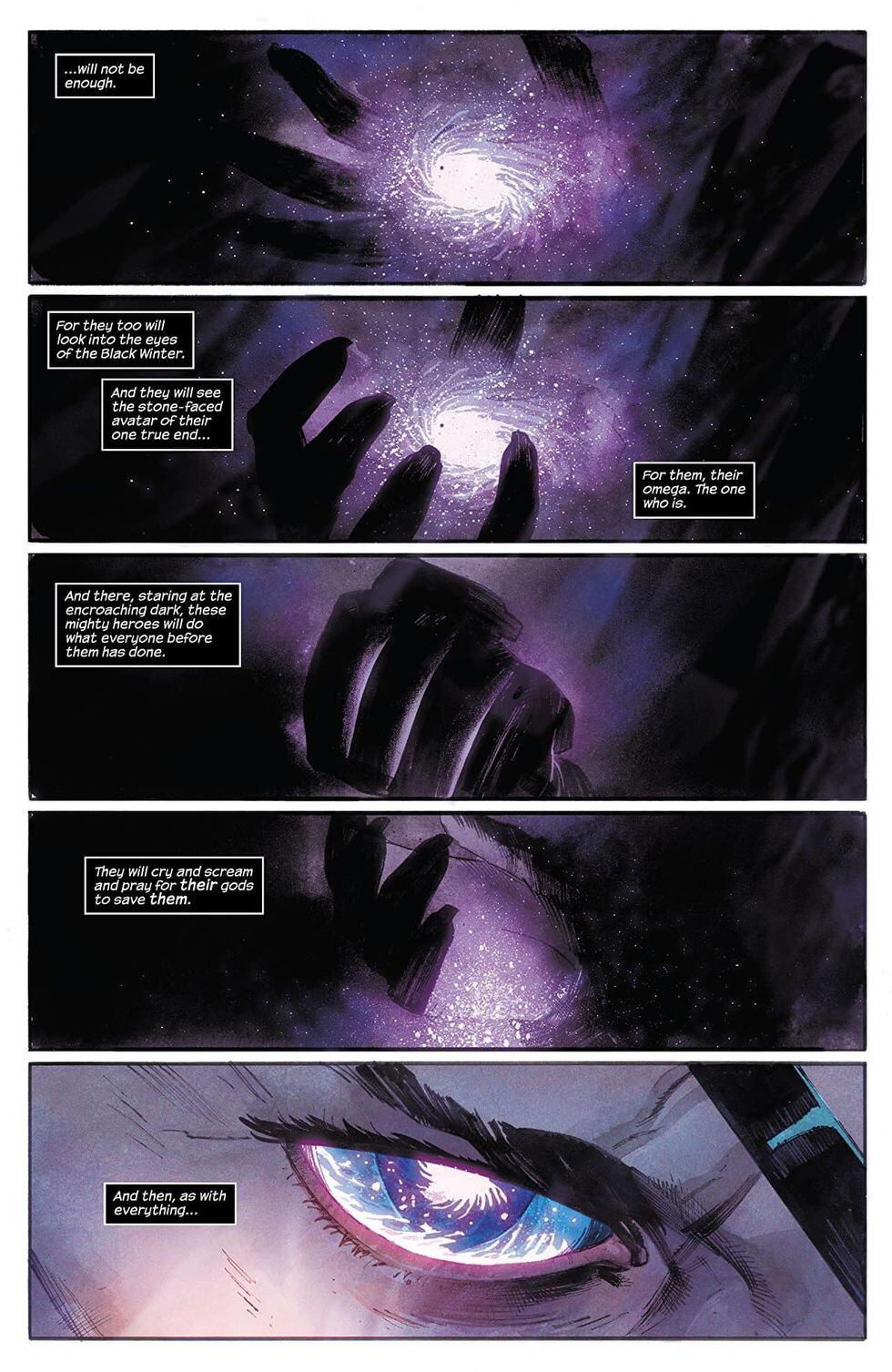 La historia comienza con una Tierra siendo consumida por el Invierno Oscuro. Pero no están los Vengadores para detener esta amenaza, sino los héroes de DC. Superman es descrito como el ‘hijo del sol’; Linterna Verde, ‘dios de la luz esmeralda’; Batman, ‘el dios de la oscuridad’; Aquaman, ‘un dios del océano’; The Flash, ‘dios de la velocidad’; y otro mencionado como de la fuerza no se especifica cual (quizás Wonder Woman).